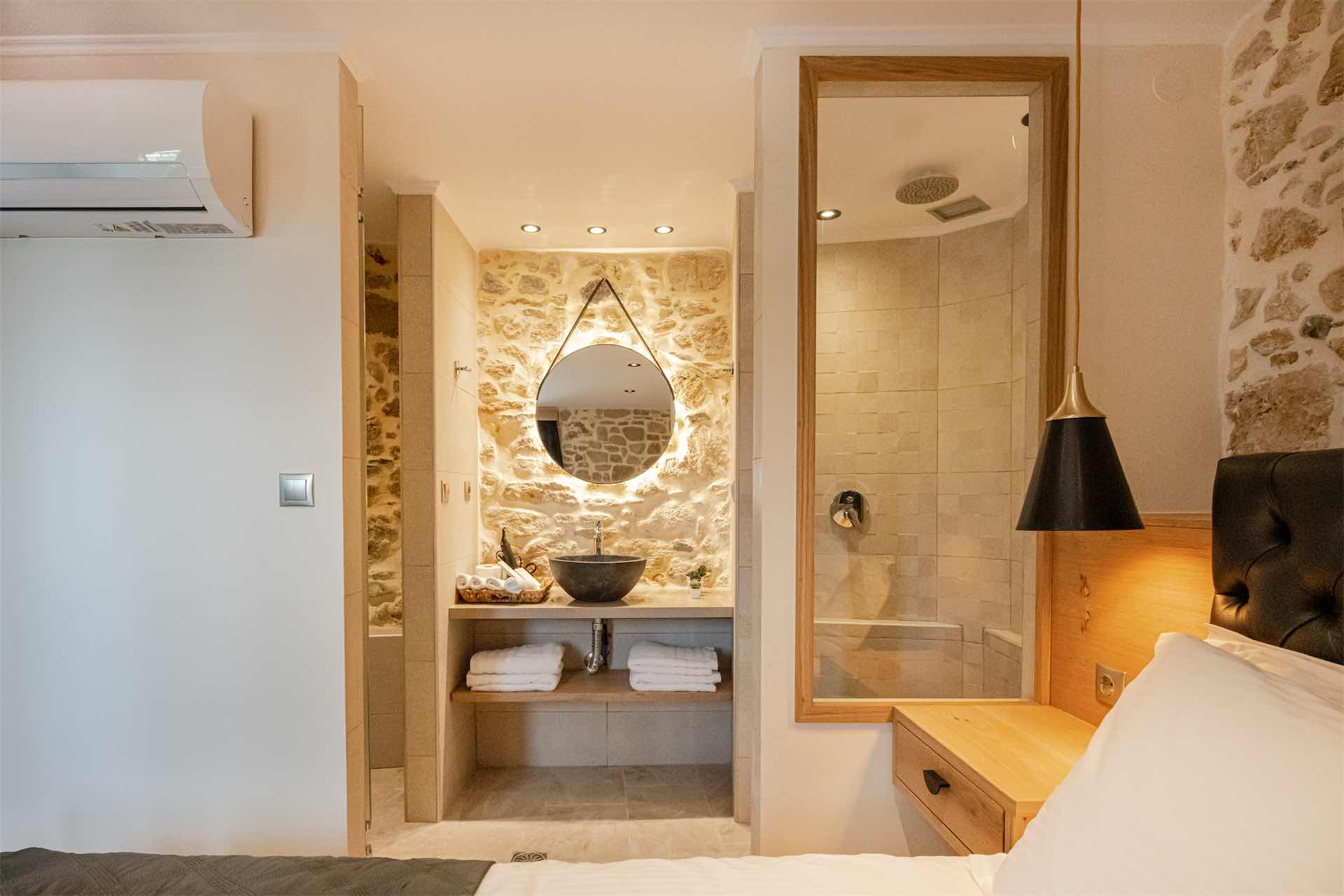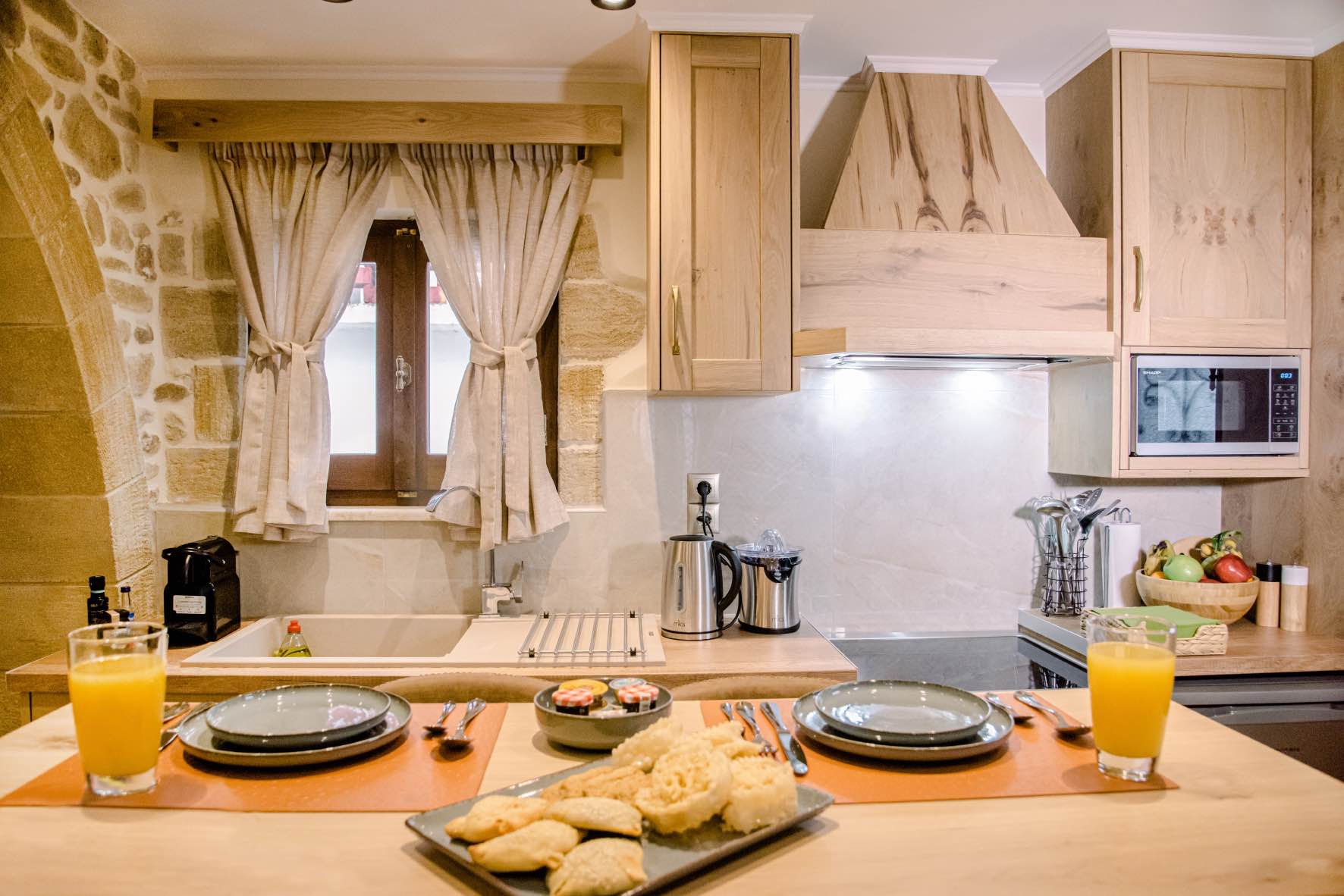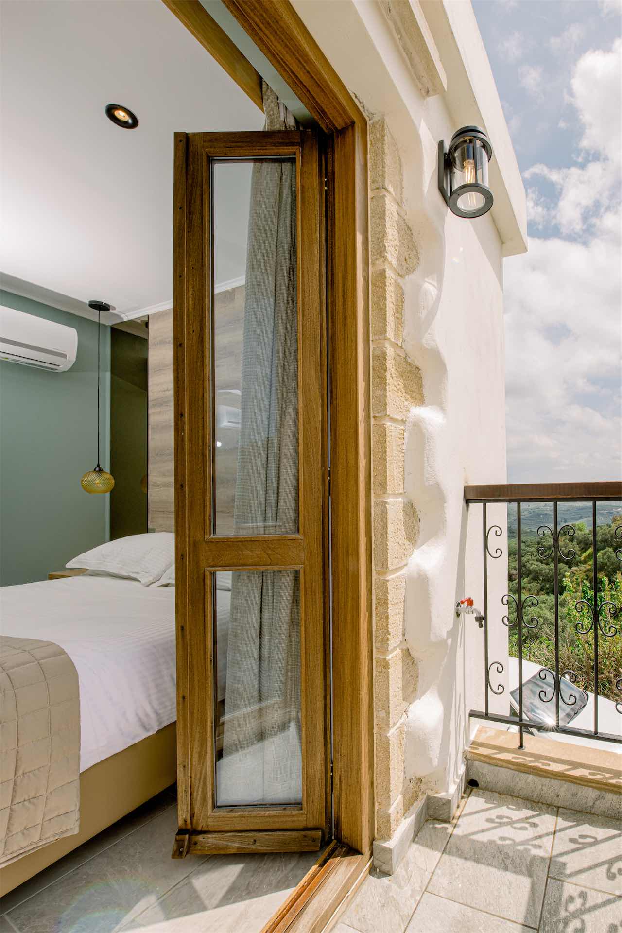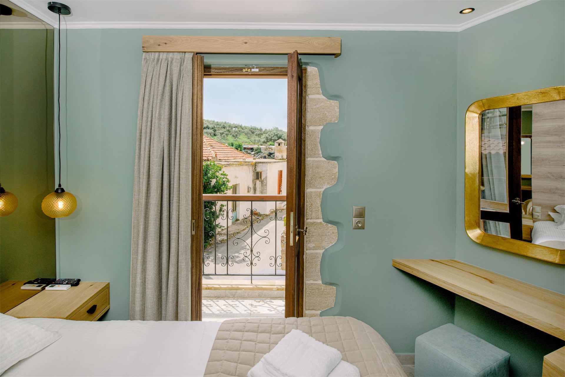 Inside the apartments, the atmosphere is calm and functional, with soft colors and natural light shaping the space. Each apartment is thoughtfully laid out, combining comfort with everyday convenience. The interiors feel relaxed rather than polished, creating a setting where guests can unwind, prepare a light meal or simply rest after a day exploring western Crete.